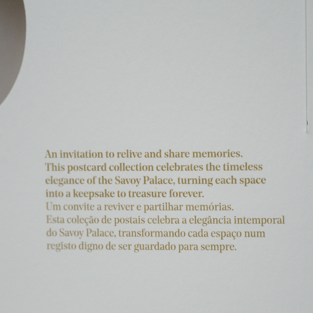 Carry with you the grandeur and sophistication of the Savoy Palace with this exclusive collection of 4 postcards. Each postcard captures a fragment of the timeless beauty of this Savoy Signature icon, perfect for sending special messages or keeping as a refined