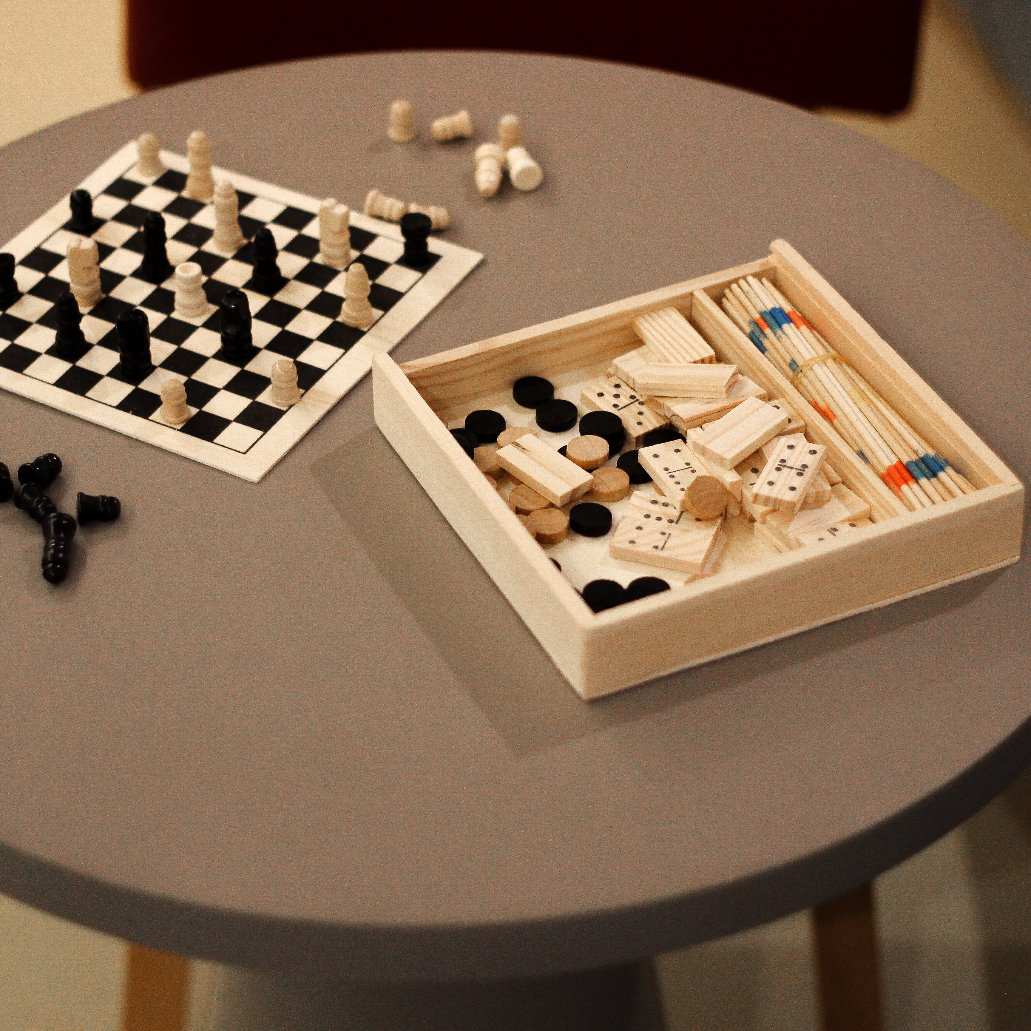 By purchasing this complete kit, you have access to four sensational games: checkers, dominoes, chess and mikado! This kit will provide fun for the whole family.