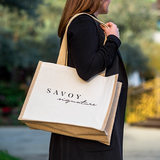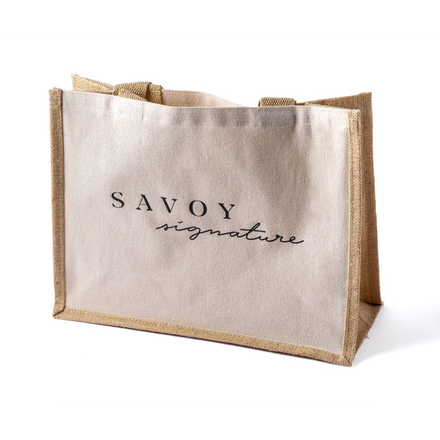 Saco de juta com duas alças e tela personalizado com logotipo Savoy Signature.